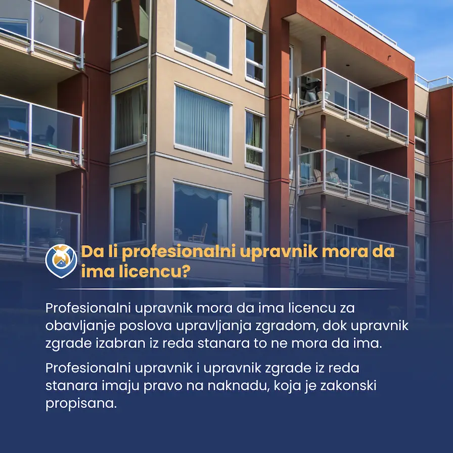 - Profesionalni upravnik mora da ima licencu za obavljanje poslova upravljanja zgrade dok upravnik zgrade izabran iz reda stanara to ne mora da ima.